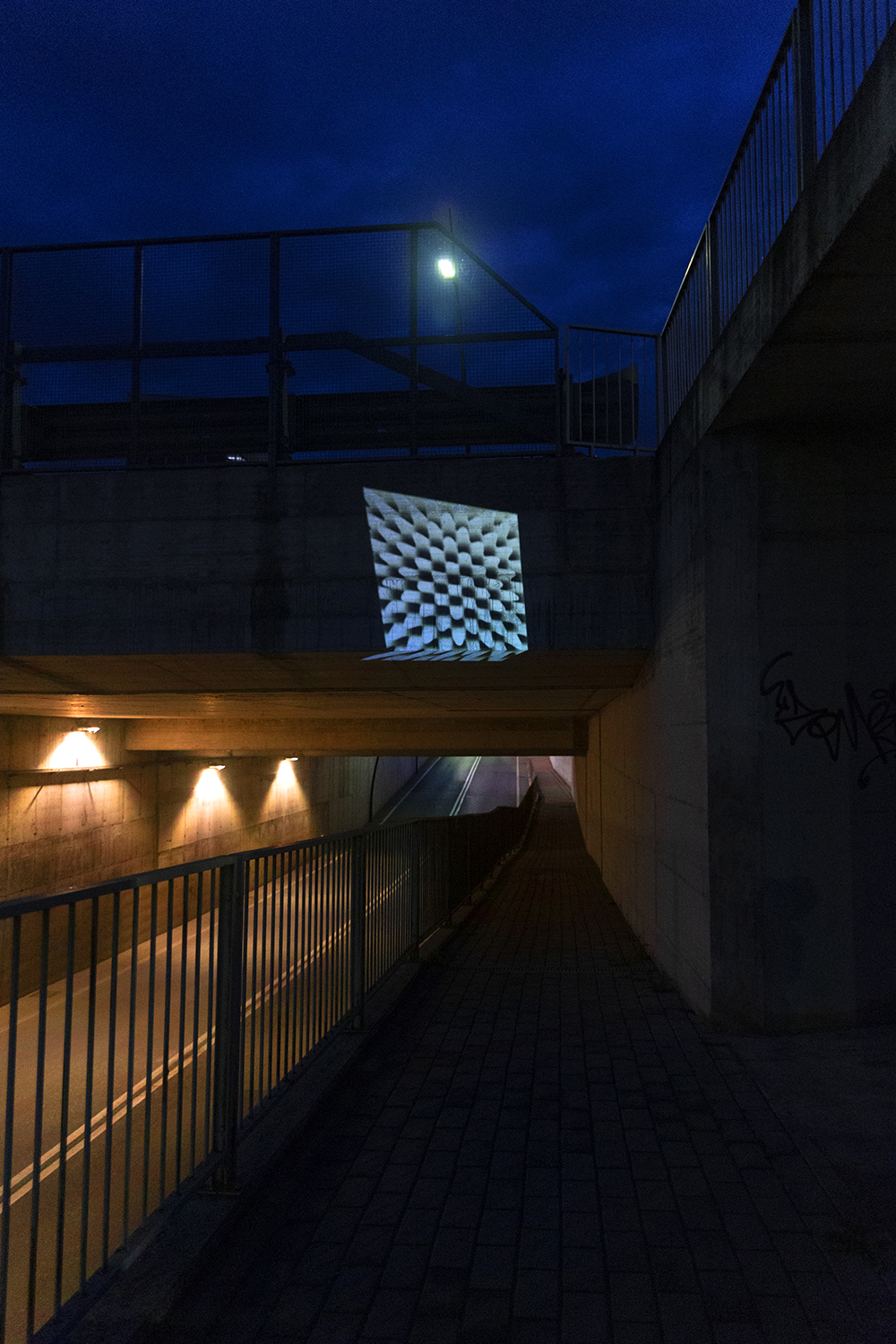 Federica’s projections in empty spaces at nigth turn the immaterial into material and viceversa, in a continuous and endless transformation.